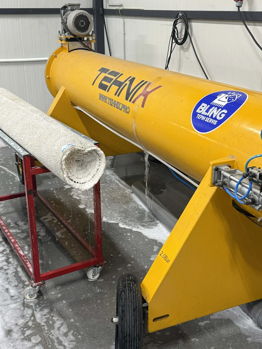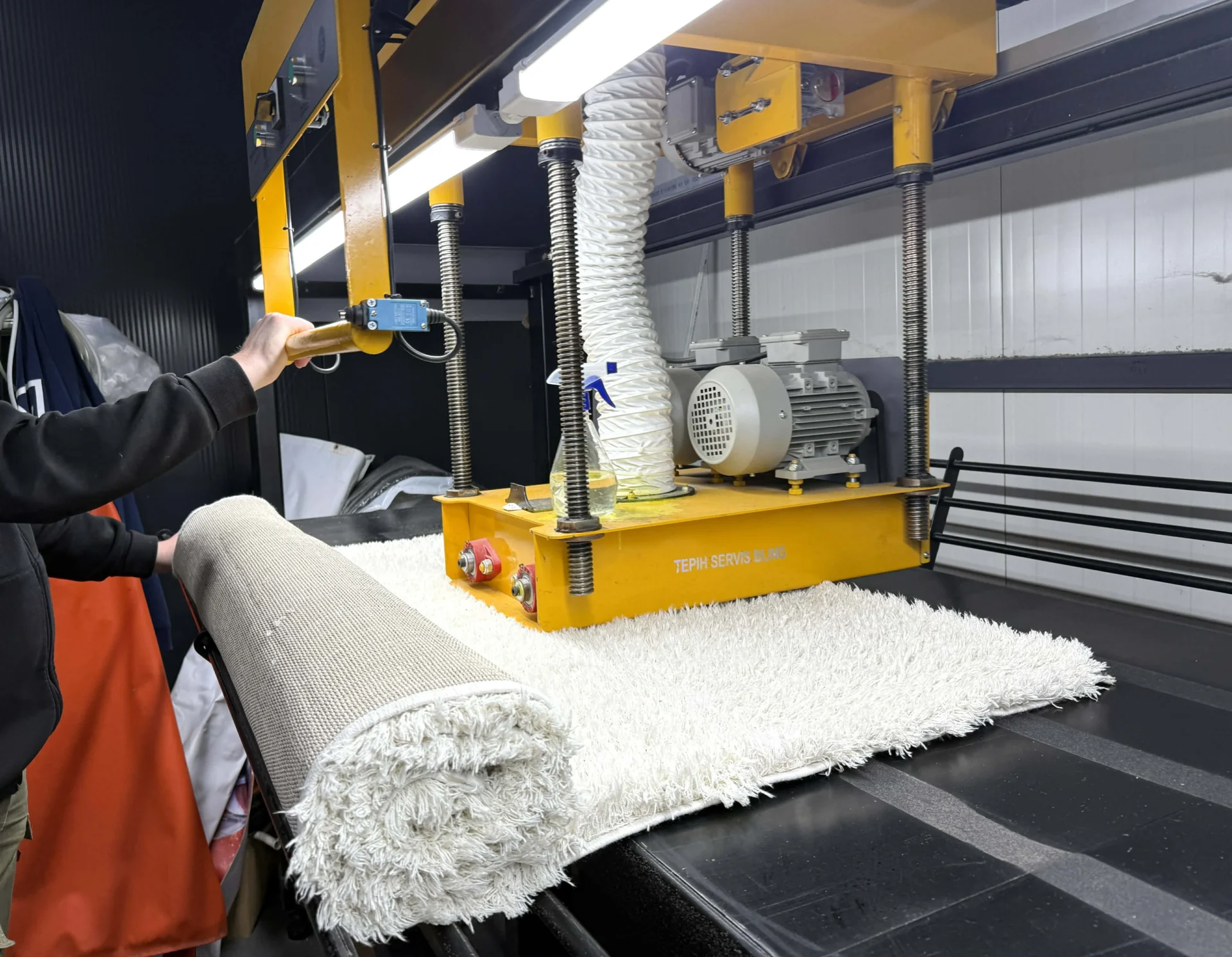 Cilindrična četka pere naličje tepiha i kupi dlake dok lice tepiha peru četke kojima se zadaje zadatak u programu koji automatski dozira hemiju, sredstva za fleke, pritisak četki… Posle ovog procesa sledi još jedna cilindrična roler četka koja služi da raščešlja tepih i pokupi, ako je eventualno ostalo dlaka, trunja, prljavštine…